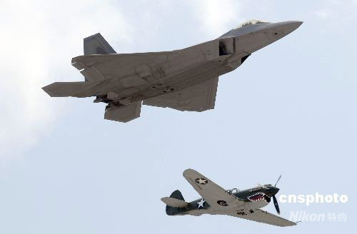 一架美軍最先進的F-22猛禽戰(zhàn)機與二戰(zhàn)時期的美軍戰(zhàn)機P-40空中共舞,讓人們體驗航空科技的突飛猛進。中新社發(fā) 張煒 攝