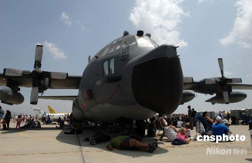圖為許多參觀者在C-130大力神飛機陰影下休息。中新社發(fā) 張煒 攝