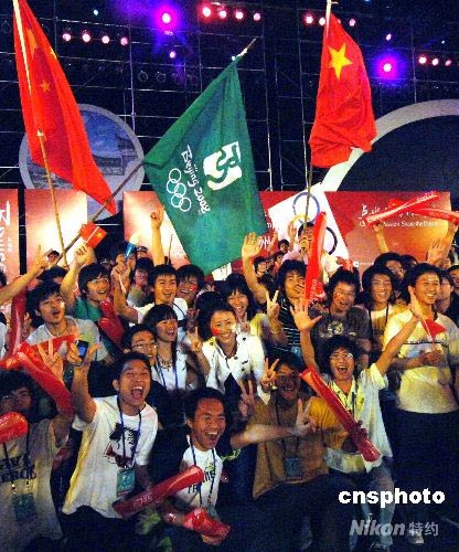 眾多福州青年在北京奧運會火炬接力境內傳遞福建福州站慶典儀式上,激情飛揚歡慶奧運圣火福州成功傳遞。中新社發(fā) 劉可耕 攝