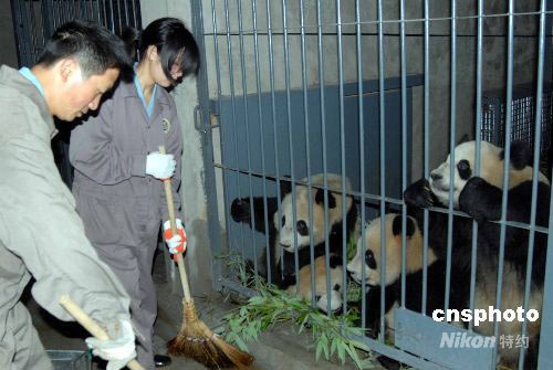 5月24日,來自四川臥龍的8只大熊貓平安抵達北京動物園,開始新的生活。圖為管理員在清掃圈舍。中新社發(fā) 羅小韻 攝