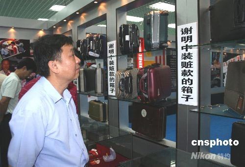 六月三日,?陂_幕的2008海南反腐倡廉警示教育展覽,展出原海南省委委員、文昌市委書記謝明中裝贓款的十八只箱子,以及價(jià)值四十萬元人民幣的滿天星手表等贓物。謝明中在擔(dān)任文昌市委書記期間,利用職權(quán),在工程審批、資金安排、干部提拔等方面為他人謀取利益,大量收受或索取賄賂,還與多名女性發(fā)生不正當(dāng)男女關(guān)系。海南省紀(jì)委共查獲謝明中轉(zhuǎn)移或藏匿的賬款折合人民幣兩千五百余萬元,另有金銀首飾等物品十七件。中新社發(fā) 關(guān)向東 攝