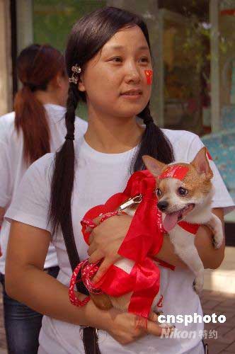 一名女孩帶著一身披紅的寵物小狗在街頭等待奧運(yùn)圣火到來。中新社發(fā) 劉萬(wàn)強(qiáng) 攝