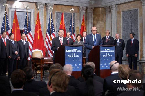 當?shù)貢r間6月18日下午,剛剛結束中美第四次戰(zhàn)略經(jīng)濟對話的中國副總理王岐山和美國財政部長保爾森,在華盛頓共同會見記者。隨后雙方簽署《中美能源環(huán)境十年合作框架》文件。中新社發(fā) 管黎明 攝