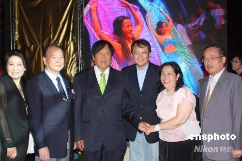 臺灣“立委”周守訓(右三)前來向《明報》企業(yè)集團董事主席張曉卿(左三)表示祝賀。中新社發(fā) 耿軍 攝
