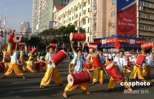 北京奧運(yùn)火炬在蘭州傳遞,當(dāng)?shù)厝罕娗庙懜挥械胤教厣耐L(fēng)鑼鼓,為奧運(yùn)火炬?zhèn)鬟f助威。中新社發(fā) 周兆軍 攝
