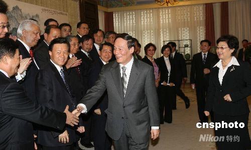 7月7日,中國(guó)國(guó)務(wù)院副總理王岐山在北京中南海紫光閣會(huì)見(jiàn)了由中國(guó)國(guó)務(wù)院僑務(wù)辦公室主任李海峰率領(lǐng)的“知名僑資企業(yè)家四川行”代表團(tuán)一行。 中新社發(fā) 王瑤 攝