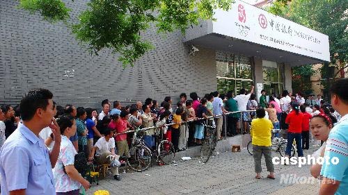 北京社區(qū)居民晝夜排隊(duì)兌換奧運(yùn)紀(jì)念鈔。中新社發(fā) 張愛(ài)東 攝