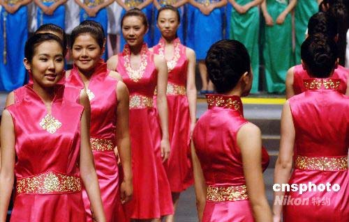 圖為志愿者展示粉紅色系列頒獎(jiǎng)服。中新社發(fā) 王東明 攝