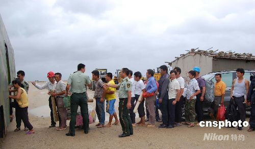 圖為邊防官兵冒著風雨用車輛將在福州新港國際碼頭施工的一百六十余位工人迅速轉(zhuǎn)移至安全地帶。中新社發(fā) 朱明海 攝