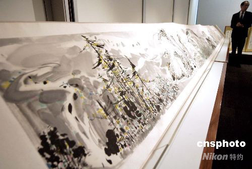 香港蘇富比二〇〇八年秋季中國書畫拍賣會將于十月六日在香港會展中心舉行,拍品總數(shù)超過二百四十件,云集多位書畫名家的優(yōu)秀作品,其中吳冠中、張大千作品成為焦點(diǎn)。圖為九月九日舉行的傳媒預(yù)展會上介紹吳冠中《長江萬里圖》,拍賣所得將捐贈“吳冠中科學(xué)與藝術(shù)創(chuàng)新獎學(xué)基金”。中新社發(fā) 張勤 攝