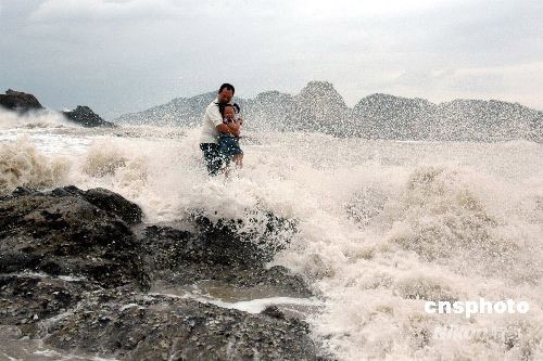 9月28日,受超強(qiáng)臺(tái)風(fēng)“薔薇”影響,浙江溫州市洞頭島海域已是波濤洶涌,海礁上掀起的巨浪高達(dá)10多米。下午2時(shí)許,一對(duì)外地父女在海邊游玩時(shí)不慎被突漲的潮水困在礁石上,隨時(shí)可能被海浪吞噬。正在海邊巡邏的洞頭邊防大隊(duì)官兵發(fā)現(xiàn)險(xiǎn)情后,迅速展開(kāi)緊急營(yíng)救,成功將父女從海浪中安全救上岸。中新社發(fā) 吳水斌 攝