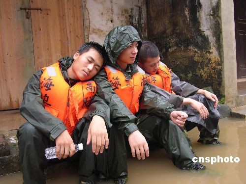 文昌邊防官兵十四日冒雨轉(zhuǎn)移文昌南陽(yáng)辦事處桃村被洪水圍困的村民,圖為勞累的官兵在雨中背靠背小息。中新社發(fā) 蔣第二 攝