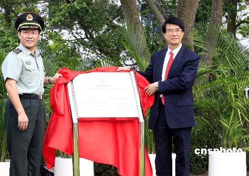 十月二十四日,中國人民解放軍駐港部隊(duì)八十位官兵訪問香港科技大學(xué)。圖為駐港部隊(duì)副司令董文久與香港科技大學(xué)校長朱經(jīng)武在科技大學(xué)草坪主持植樹紀(jì)念及牌匾揭幕儀式。中新社發(fā) 張勤 攝