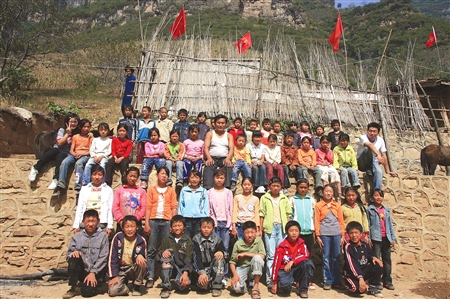 古路村小學(xué)全家福,靈魂人物申老師光著膀子笑坐中央。