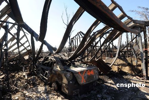 十一月十八日,洛杉磯北部希爾瑪市的一個(gè)居民區(qū)在大火中幾乎被焚毀,整個(gè)社區(qū)六百零八間住宅中的四百八十間蕩然無存。這是四十多年來,洛杉磯遭受的房屋損失最嚴(yán)重的火災(zāi)。中新社發(fā) 張煒 攝