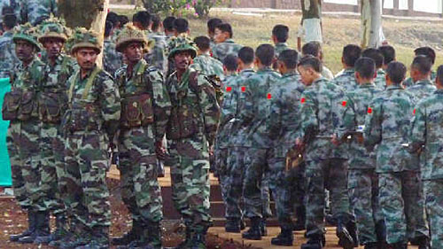 中國(guó)士兵列隊(duì)走過印度士兵。