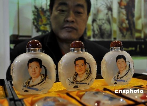 12月18日,第三屆中國北京國際文化創(chuàng)意產(chǎn)業(yè)博覽會在中國國際展覽中心開幕。該展每年舉辦一次,已成為中外文化創(chuàng)意產(chǎn)業(yè)界相互透視產(chǎn)業(yè)動(dòng)向和趨勢、交流前沿思想理念、傳遞最新政策信息,進(jìn)行產(chǎn)業(yè)合作和產(chǎn)品交易的重要窗口。圖為由河北衡水畫家創(chuàng)作的“神七”航天員肖像鼻煙壺。中新社發(fā) 潘旭臨 攝
