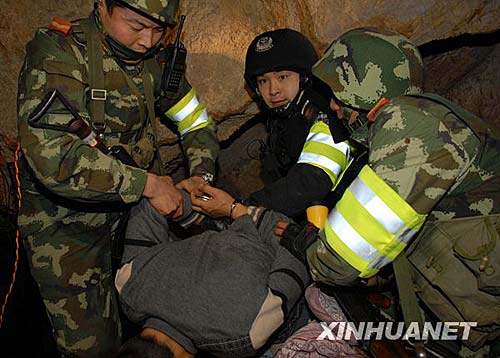 公安干警和武警戰(zhàn)士正在對山洞中地下兵工廠內(nèi)的犯罪嫌疑人實施抓捕。劉潺 攝