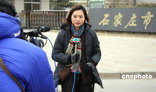 圖為當(dāng)日上午,在石家莊中級(jí)法院門口,來(lái)自香港的電視臺(tái)記者冒著寒風(fēng)做現(xiàn)場(chǎng)報(bào)道。中新社發(fā) 翟羽佳 攝