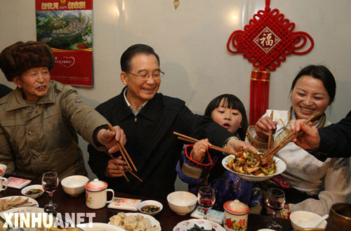 1月25日,溫家寶總理在汶川映秀鎮(zhèn)板房安置小區(qū)吳志遠家吃年夜飯。這是溫家寶請大家品嘗他剛炒出的回鍋肉。1月24日至25日,中共中央政治局常委、國務(wù)院總理溫家寶來到四川受災(zāi)最為嚴重的北川、德陽、汶川等地,和災(zāi)區(qū)人民一起過年。作者:姚大偉