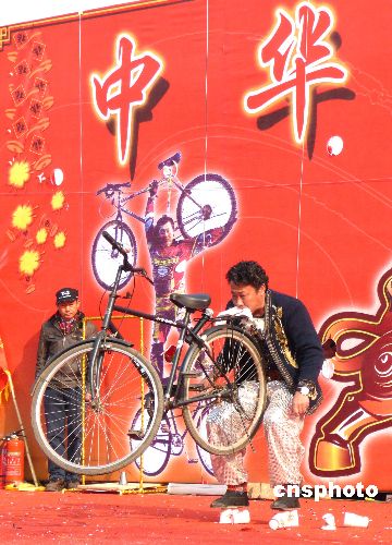 站在一次性紙杯上用嘴叼起自行車。中新社發(fā) 玉龍 攝