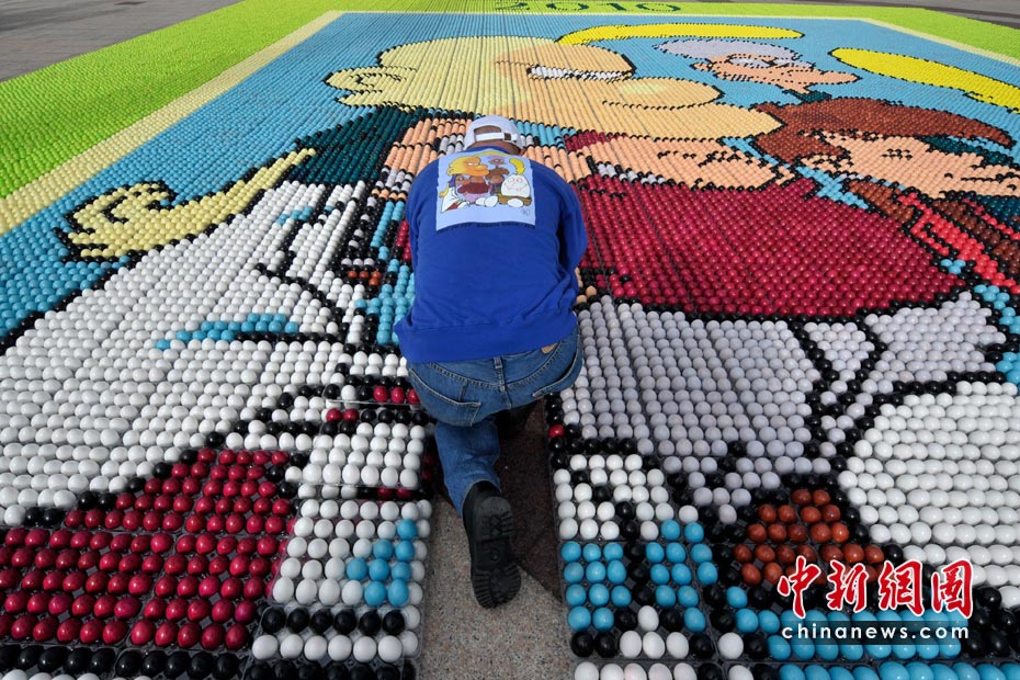 4月4日,瑞士洛桑的廣場上,人們用6.6萬枚彩蛋拼出一畫巨大的卡通圖像,用來為患癌癥兒童籌集善款。圖片來源:中國新聞網(wǎng)