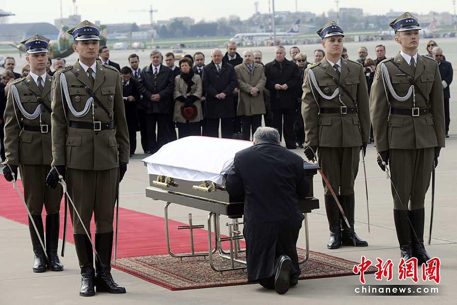 4月10日,卡欽斯基乘坐專機(jī)從華沙飛往俄羅斯斯摩棱斯克市,參加卡廷森林事件70周年紀(jì)念活動(dòng)。途中飛機(jī)在斯摩棱斯克“北方”軍用機(jī)場(chǎng)附近降落時(shí)失事,共造成包括卡欽斯基夫婦及眾多政府高官在內(nèi)的96人死亡。慘劇發(fā)生后,舉世震驚。圖為卡欽斯基的孿生兄弟在遺體前跪拜。