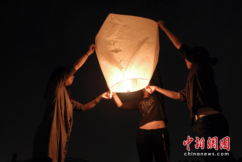 4.21全國哀悼日晚上,廣東外語外貿(mào)大學的學生們在廣州大學城內(nèi)點燃孔明燈,為玉樹地震災(zāi)區(qū)人民祈福。 中新社發(fā) 龍宇陽 攝