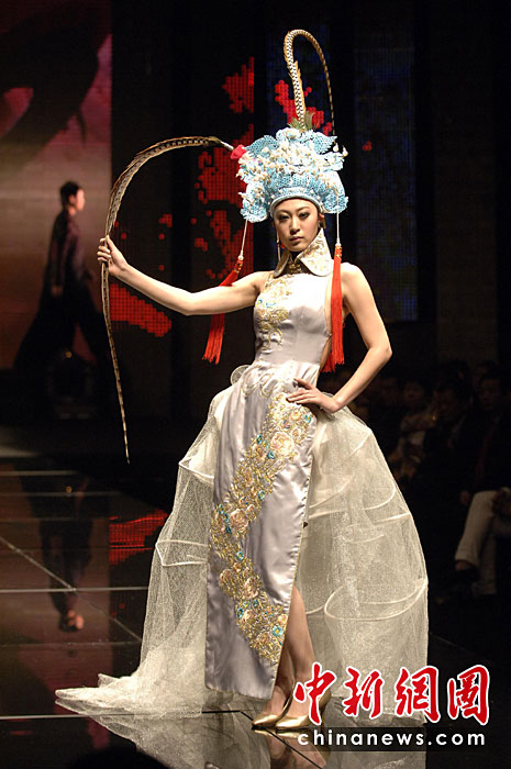 4月20日晚,首屆海西國際時裝周在福建石獅閉幕,本屆時裝周吸引了來自海峽兩岸的紡織服裝界企業(yè)家和知名服裝設(shè)計師。期間舉辦了12場時裝品牌和設(shè)計師作品動態(tài)發(fā)布會。圖為模特展示古今潮流結(jié)合的服裝。王東明 攝