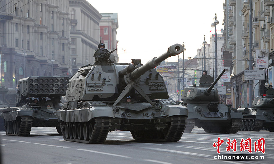 此次紅場(chǎng)閱兵包括兩部分內(nèi)容:歷史部分和現(xiàn)代部分。歷史部分由身穿衛(wèi)國(guó)戰(zhàn)爭(zhēng)時(shí)期軍服的士兵在鵝卵石道上進(jìn)行,同時(shí)還會(huì)有9輛T-34坦克和8輛SU-100自行火炮,F(xiàn)代部分由13輛老虎裝甲車、BTR-80裝甲車、BMP-3步兵戰(zhàn)車、T-90A坦克和S-400防空系統(tǒng)等。圖片來(lái)源:中國(guó)新聞網(wǎng)