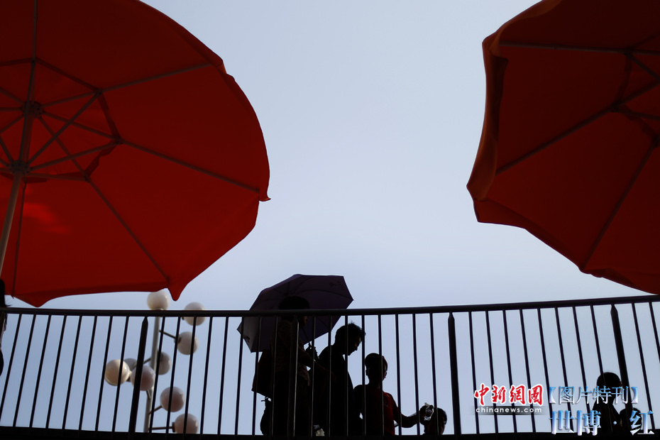 紅色象征著熱量與活力,紅色也象征著興奮與激情,在世博園區(qū)內(nèi)游覽,總會有一抹濃艷的紅色闖入到記者鏡頭之中,讓世博變得更加火辣。圖為紅傘下的游客。中新社記者 盛佳鵬 攝