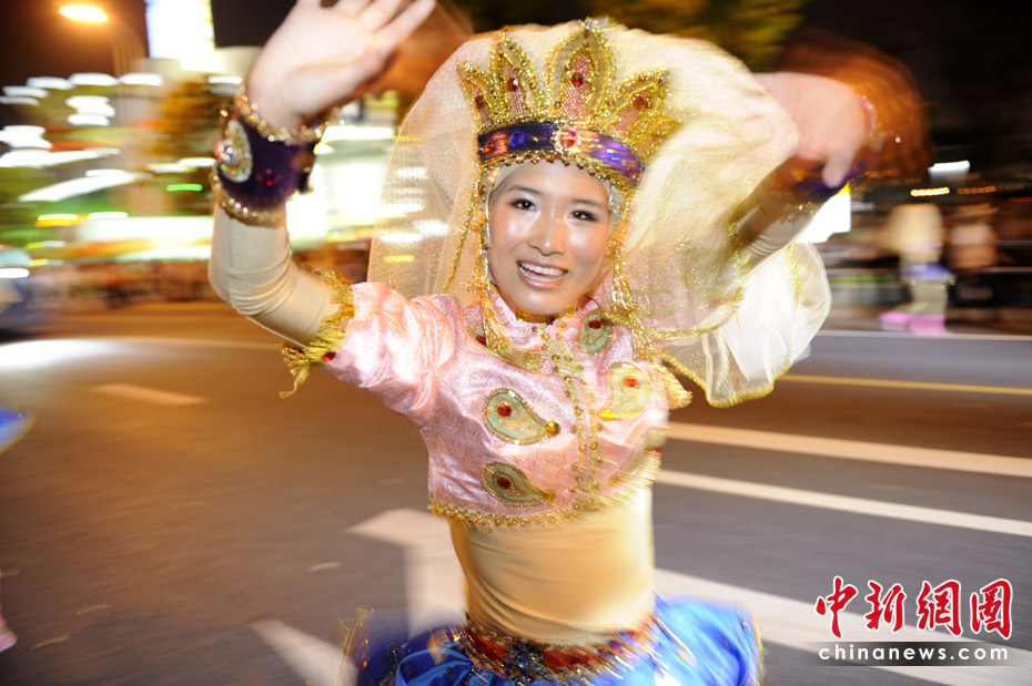 5月2日晚,由一輛輛充滿異域風(fēng)情的花車和身著盛裝的表演者組成的“歡樂(lè)盛裝大巡游”在世博園區(qū)舉行。中新網(wǎng)記者 王紅綱 攝