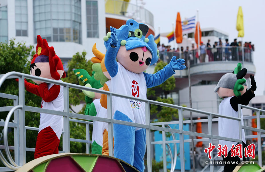 5月4日,世博會(huì)北京周花車(chē)巡游中的福娃向觀眾揮手致意。當(dāng)日,世博會(huì)北京周開(kāi)幕。
