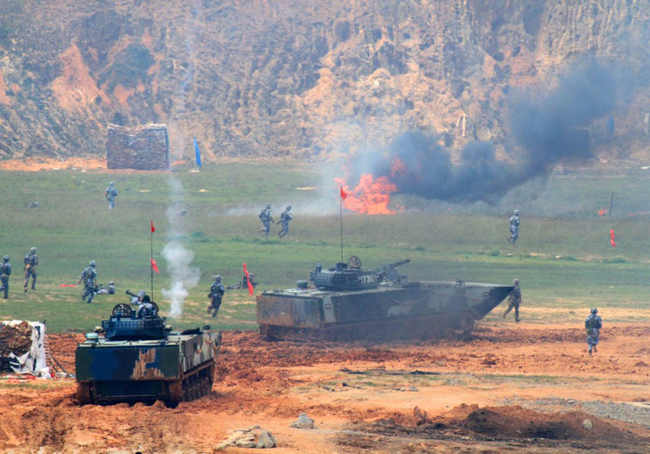 5月5日,海軍陸戰(zhàn)隊(duì)在訓(xùn)練場(chǎng)進(jìn)行登陸作戰(zhàn)實(shí)兵實(shí)彈演練。圖片來(lái)源:新華網(wǎng) 查春明攝