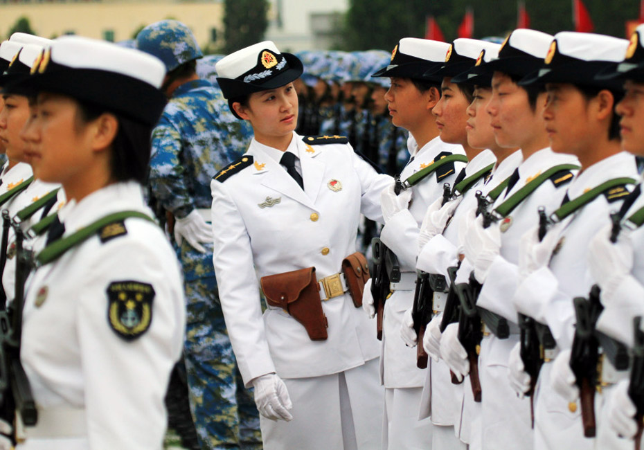 參加閱兵式的海軍陸戰(zhàn)隊女隊員在做準備。圖片來源:新華網(wǎng) 查春明攝