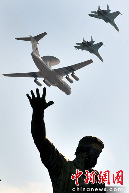5月9日,俄羅斯在莫斯科紅場舉行盛大的閱兵式,慶祝衛(wèi)國戰(zhàn)爭勝利65周年。莫斯科時間5月9日上午10點(北京時間9日下午2點)許,閱兵式正式開始。圖為空中梯隊飛越紅場上空。