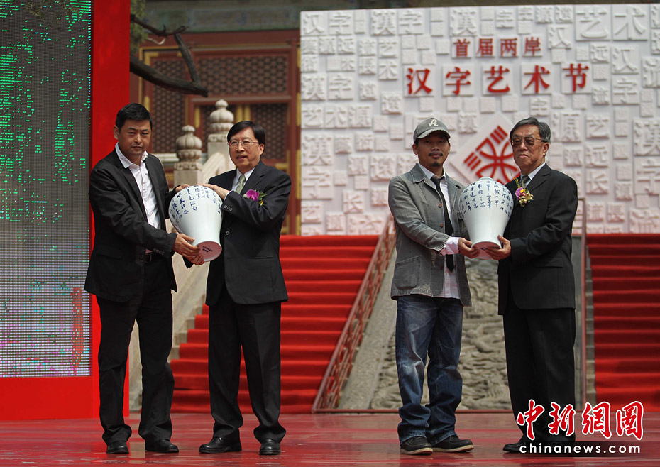 5月15日,首屆“兩岸漢字藝術(shù)節(jié)”新聞發(fā)布會在北京孔廟舉行。原文化部長、著名作家王蒙與臺灣文化總會會長劉兆玄等共同書寫漢字——“漢字藝術(shù)源遠流長”。 中新社發(fā) 蘇丹 攝