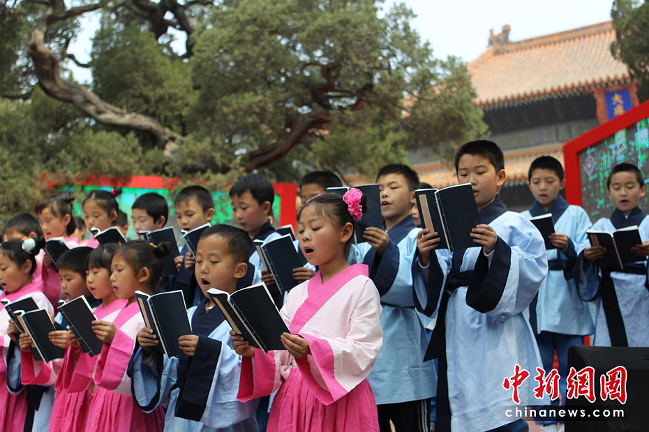 5月15日,首屆“兩岸漢字藝術(shù)節(jié)”新聞發(fā)布會(huì)在北京孔廟舉行。原文化部長、著名作家王蒙與臺(tái)灣文化總會(huì)會(huì)長劉兆玄等共同書寫漢字——“漢字藝術(shù)源遠(yuǎn)流長”。 中新社發(fā) 蘇丹 攝