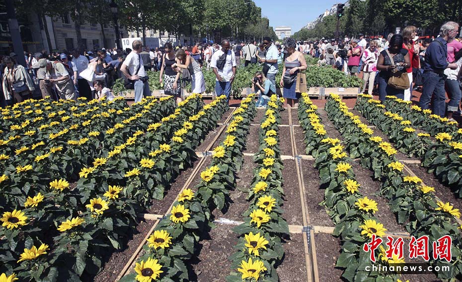 5月24日,法國總統(tǒng)薩科齊和妻子布呂尼參觀在法國巴黎舉行的“自然首都”展。該項(xiàng)展覽是由街頭藝術(shù)家加德·魏爾聯(lián)手法國“青年農(nóng)民協(xié)會(huì)”和林業(yè)協(xié)會(huì)共同發(fā)起的的,將百余種農(nóng)作物、樹木和動(dòng)物“齊聚”法國首都巴黎的香榭麗舍大街,令這條“香街”變身“綠色的自然世界”。圖片來源:中國新聞網(wǎng)
