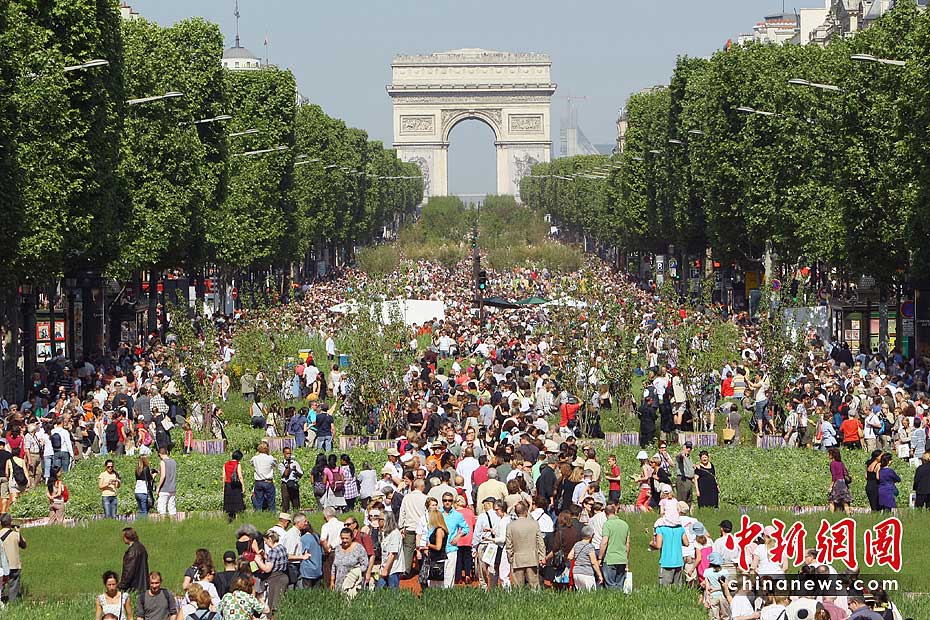 5月24日,法國(guó)總統(tǒng)薩科齊和妻子布呂尼參觀在法國(guó)巴黎舉行的“自然首都”展。該項(xiàng)展覽是由街頭藝術(shù)家加德·魏爾聯(lián)手法國(guó)“青年農(nóng)民協(xié)會(huì)”和林業(yè)協(xié)會(huì)共同發(fā)起的的,將百余種農(nóng)作物、樹木和動(dòng)物“齊聚”法國(guó)首都巴黎的香榭麗舍大街,令這條“香街”變身“綠色的自然世界”。圖片來(lái)源:中國(guó)新聞網(wǎng)