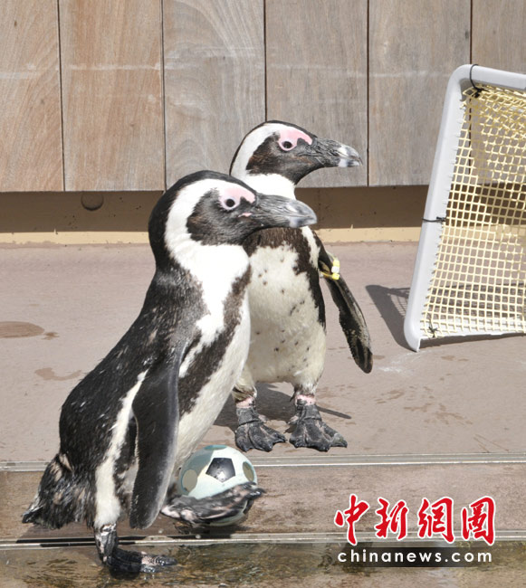 6月1日,在日本東京一家海洋館里,幾只企鵝“披掛上陣”,進行了一場別開生面的足球賽,迎接世界杯。