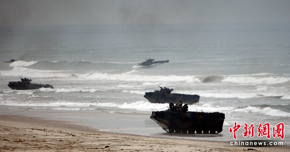 當?shù)貢r間6月4日,約5000名水兵和陸戰(zhàn)隊員在美國加利福尼亞州舉行了代號為“黎明突擊”的搶灘登陸軍事演習。圖片來源:中國新聞網(wǎng)