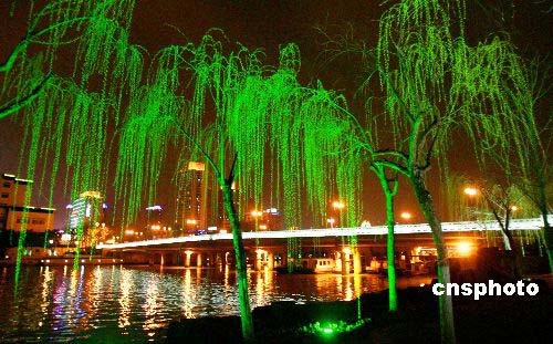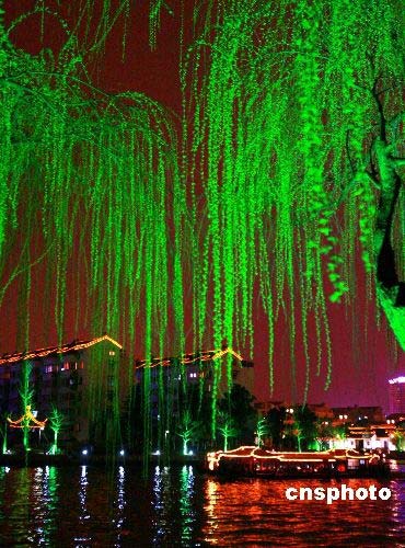 3月17日晚,蘇州環(huán)城河邊楊柳與建筑物在景觀燈的映照下格外迷人。陽(yáng)春三月,當(dāng)夜幕降臨后的蘇州環(huán)城湖畔,排列成行的絲絲垂柳在景觀照明燈下,霓裳艷影,水上游船、古橋和兩岸建筑物相映成輝,璀璨奪目,景色迷人。中新社發(fā) 蘇秀 攝