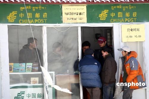 自4月28日,受邀采訪2008北京奧運會火炬接力珠峰展示活動的中外媒體入住珠峰大本營絨布新聞中心后,新聞中心住房、通訊、食宿和醫(yī)療等設施齊備且環(huán)保,為中外記者提供采訪保障。這里有世界上海拔最高的郵政代辦所,居住的活動房、電力設施、網(wǎng)絡等所使用的均是環(huán)保材料,符合珠峰自然保護區(qū)的各項環(huán)保規(guī)定。圖為記者在世界上海拔最高的郵政局-中國珠穆朗瑪峰臨時郵政局辦理業(yè)務。 中新社發(fā) 盛佳鵬 攝