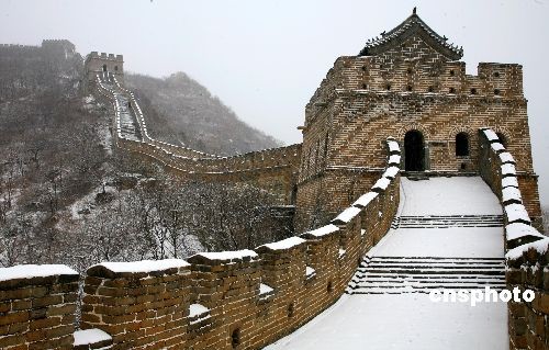 12月10日,北京慕田峪長城初雪景色。當(dāng)日,北京下了冬季第一場雪,紛飛的雪花灑落在長城上,宛若一條銀白色的長龍,給游客帶來了驚喜。中新社發(fā) 卜向東 攝