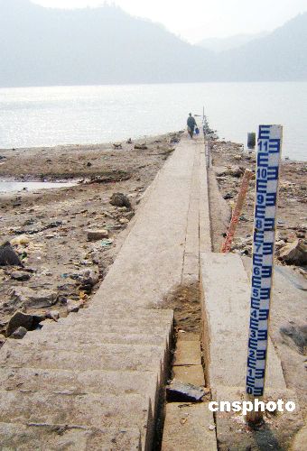 2007年12月7日,湖北宜昌江段裸露的江灘和水位標尺。目前長江已進入一年一度的枯水期,近期長江中游水位持續(xù)退落,比多年同期平均水位低近1.5米,根據(jù)當前枯水形勢及水位水情特征,長江航務管理局決定,長江中游實施二級橙色預警。對通過中游的船舶吃水深度進行規(guī)定,普通貨船實際吃水控制在2.4米及以下,危險品船舶實際吃水控制在2.3米及以下,下行船舶超過吃水限制的一律在宜昌港減載。中新社發(fā) 任衛(wèi)紅 攝