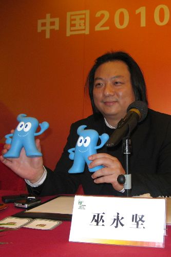 十二月十九日凌晨,臺灣設(shè)計師巫永堅亮相中國二0一0年上海世博會吉祥物揭曉新聞發(fā)布會,受到兩岸媒體追捧。巫永堅和他的團隊是上海世博會吉祥物“海寶”采用漢字造型的理念原創(chuàng)者,其最初設(shè)計的卡通漢字“大寶”形象,在全球兩萬六千余件應(yīng)征作品中脫穎而出,巫永堅被媒體譽為“海寶的爸爸”。上海世博會最終揭曉的吉祥物“海寶”形象,經(jīng)由“海派”設(shè)計名家邵隆圖及其團隊的再創(chuàng)作,兩岸攜手使“大寶”定格為“海寶”。中新社發(fā) 裔蕊華 攝