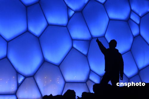 1月19日晚,北京奧運(yùn)工程之一的國家游泳館(“水立方”)進(jìn)行調(diào)試造型燈光,“水立方”中每個(gè)氣泡被照射上藍(lán)色燈光,令人暢想奧運(yùn)水世界。據(jù)悉,1月31日這里將舉行奧運(yùn)測試賽,屆時(shí)“水立方”將被照射更多的彩色燈光。 中新社發(fā) 吳芒子 攝