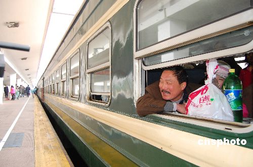 1月28日中午,一名登上回家列車的旅客開心地從車窗回望廣州火車站。從26日到28日上午十時(shí),廣州火車站恢復(fù)開出列車五十六列,其中迂回開出列車三十列。但廣州火車站仍有七萬多名旅客滯留。中新社發(fā) 柯小軍 攝