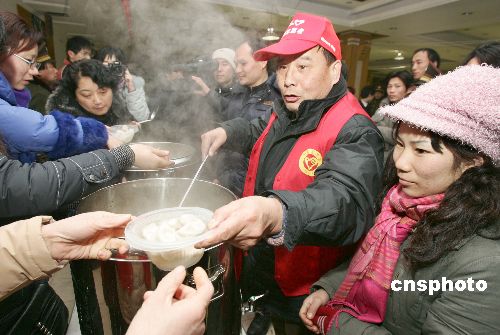 近期由于受大雪天氣影響導致國內(nèi)大范圍的鐵路、公路交通受阻或中斷,使大批返鄉(xiāng)旅客滯留杭州火車站、杭州火車東站和市區(qū)各大長途汽車站,從1月27日起,杭州市開辟了部分劇院、大廈、會展中心、體育館等公共場所及搭建軍用帳篷等作為滯留旅客的臨時駐留點。至1月30日下午,已先后接待了近10萬人次的滯留旅客,當?shù)氐恼块T、企事業(yè)單位、部隊、公安、街道、衛(wèi)生、共青團、市民志愿者等紛紛行動起來,按照“有水喝、有飯吃、有地方安頓、生病有醫(yī)治、困難群眾有救助”的要求,以各種形式盡力為所有滯留旅客提供生活保障和溫馨服務。 中新社發(fā) 李忠 攝